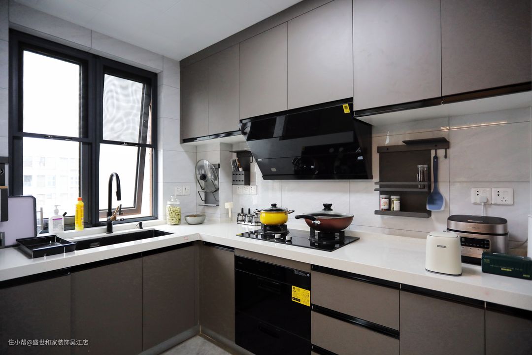 L型的厨房台面格局让每个操作区域动线分明,嵌入式蒸烤箱减少了家电给桌面带来的杂乱,厨具上墙处理,更使下厨时有条不紊。