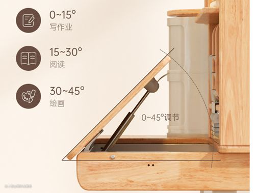 很多学习桌的桌面可以倾斜,这主要是为了配合孩子在不同时候使用书桌都能获得最好的体验。