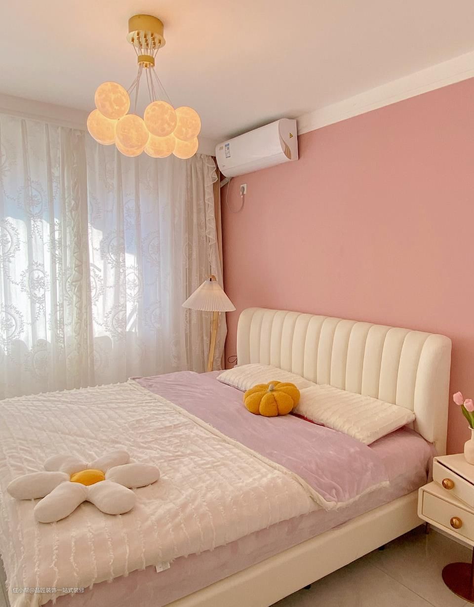 简约奶油风的卧室带有清新感,步入室内能感受到温润质感,便给人一种自然放松的视觉感。台床的设计中,尽量地降低高度,贴近地面,从视觉和心理上获的满满安全感。