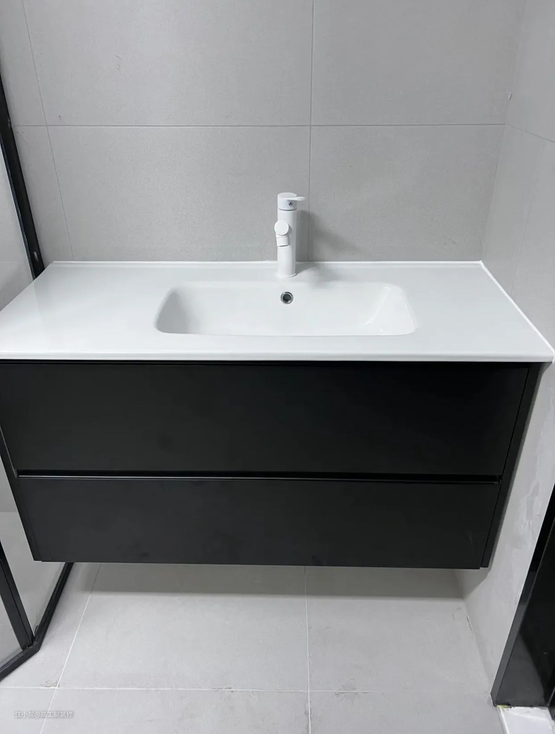 所以现在大部分用户那么追捧岩板,主要原因就是因为岩板吸水率很低,吸水率越低越容易清洁,如果喜欢岩板的业主,可以考虑这款浴室柜,胶选择防霉透明胶,固定好就不会出现掉盆的问题。