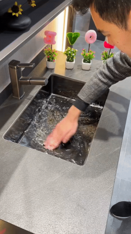 ④借鉴国外的岩板一体盆工艺,用不锈钢盆在底下托底,即使岩板接缝处漏水了,不锈钢盆也能做到二次保障。