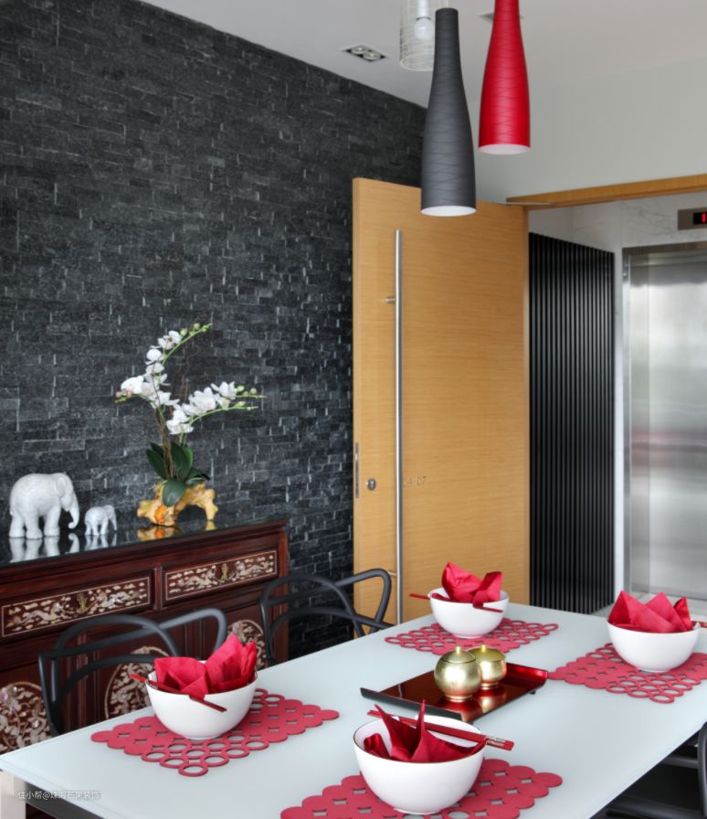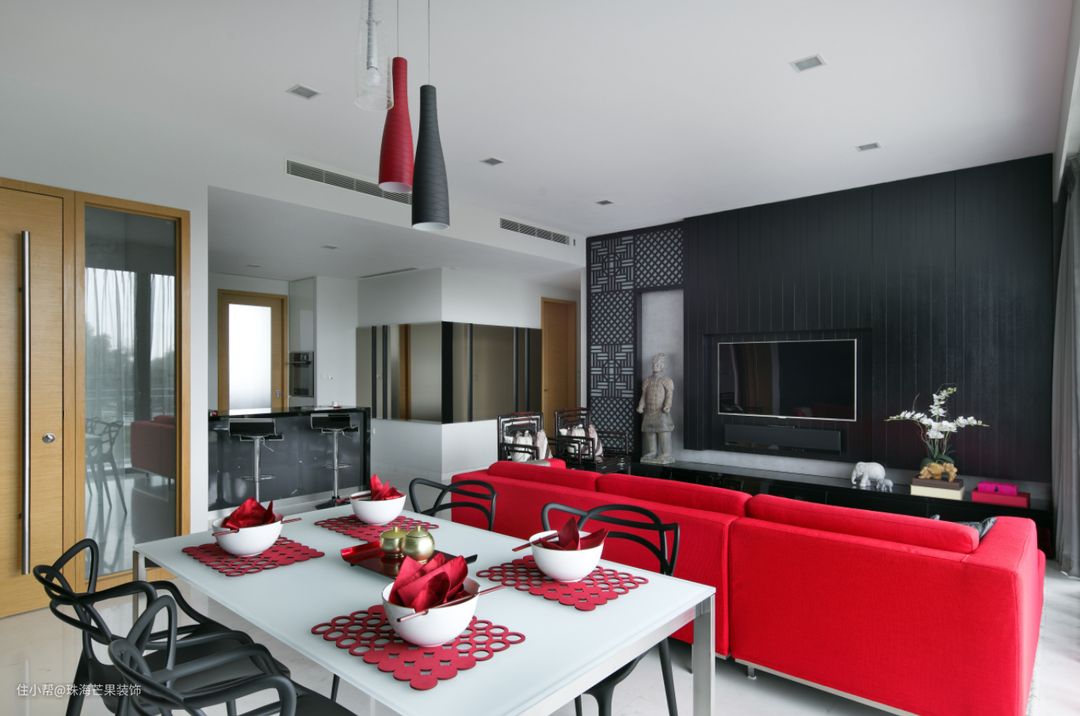 色彩搭配:红色和黑色是非常强烈的颜色,因此需要合理地运用。可以在整个空间中采用黑白灰为主色调,然后通过少量的红色点缀来增加活力和鲜明度。