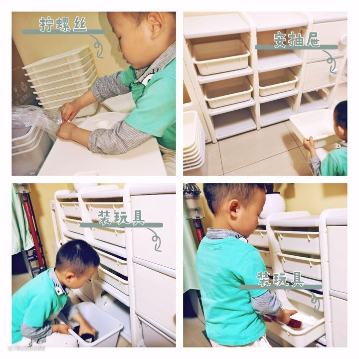 从组装开始,弟弟就亲自“上手”了,这次除了帮他组装好(过程中他试图扭螺丝,并没有成功,参与第一)、摆放到位以外,他拒绝了我们的所有后续帮助,包括安排置物盒、把玩具和部分能拿动的书放进来,全是他自己干的!这个过程让人惊讶。