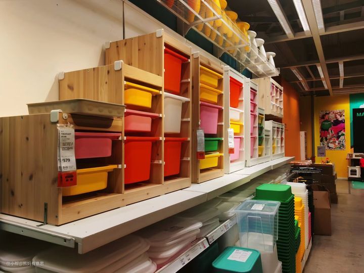 单纯收纳玩具的话宜家这款实木收纳柜就很专业了,柜子高低、形态、里面的储物盒都有多种规格可以选择,可以根据家里地方大小和装修风格充分DIY,大盒子的容量足够大,小盒子差不多A5纸大小,很适合拼图、乐高之类琐碎细小物品的收纳。