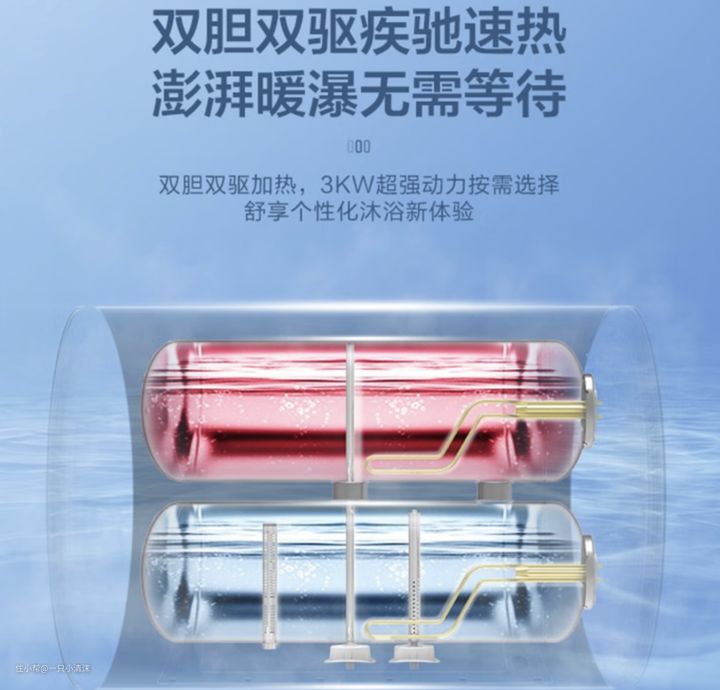 它通过双胆+双加热管的技术将两个内胆同时加热,而且能实现两个胆各自自动控制,把水的加热速度提升到了最大程度。
