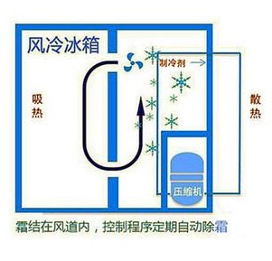风冷:也称为无霜冰箱,由风扇把冷气吹直接进冰箱内部从而降低冰箱内部温度,是目前的主流冷冻方式。虽然无霜冰箱不需要手动除霜,但其实也是结霜的。只不过是在我们看不见的蒸发器表面结霜,每隔一段时间蒸发器就会加热融化冰霜,融化的霜水会由排水管道流出。