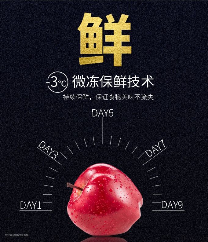 特点:在这里不得不提美的微晶特有的一周鲜技术,那就是以以内置传感器探测食材温度,实现精准控温,让食材保持略微结晶的状态。可以做到肉类海鲜7天不冻依旧原鲜。