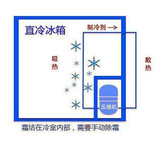直冷:蒸发器贴在冰箱的背后或者裸露处,冷气由冷气管道传输间接降低冰箱内部温度。这类机型冷冻能力强,结构简单维修成本低。但是容易结霜,需要定期手动除霜,而且靠近冷气管的食材会被冻坏。如果冰箱容积较大时会出现冷冻死角。直冷冷冻多出现在小容量、售价低的机型上。