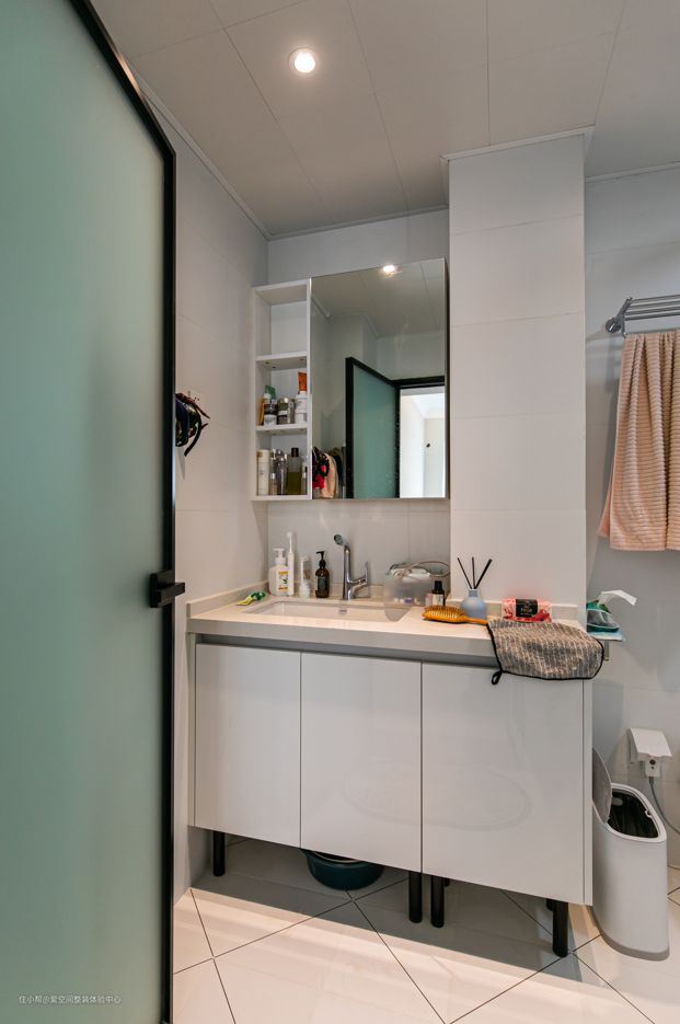 浴室柜选用法尼尼定制品牌。尺寸是1.1m*60cm,奶油白的柜体很百搭,和整个空间完美的融合。