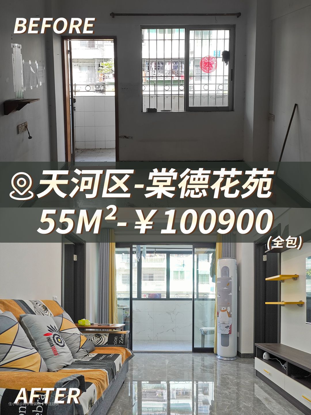 项目位于广州天河区棠德花苑,套内55平,旧房改造,全包花费10W+