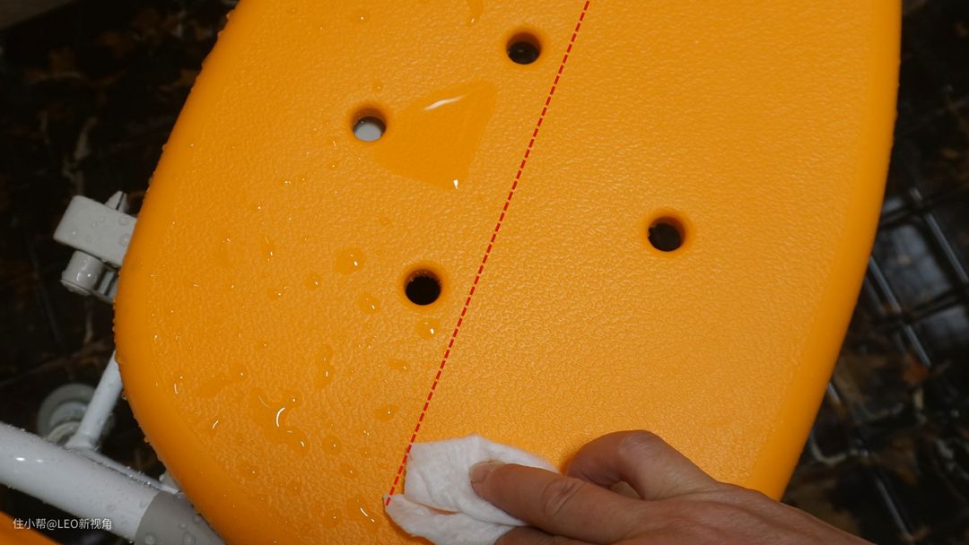 EVA材质不吸水,也很容易擦拭清洗,轻轻一擦,可以明显看到EVA的表面已经完全干了。还有就是新开箱的椅子完全没有异味,塑料味,环保材料使用起来更放心。