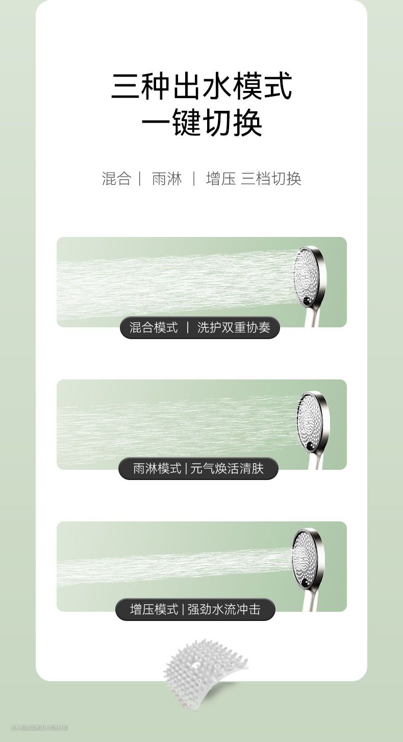 3、增压模式水流强劲,夏天冲澡简直不要太畅快!在沐浴过程中就能轻松变换雨淋水花,带来一种前所未有的沐浴体验!