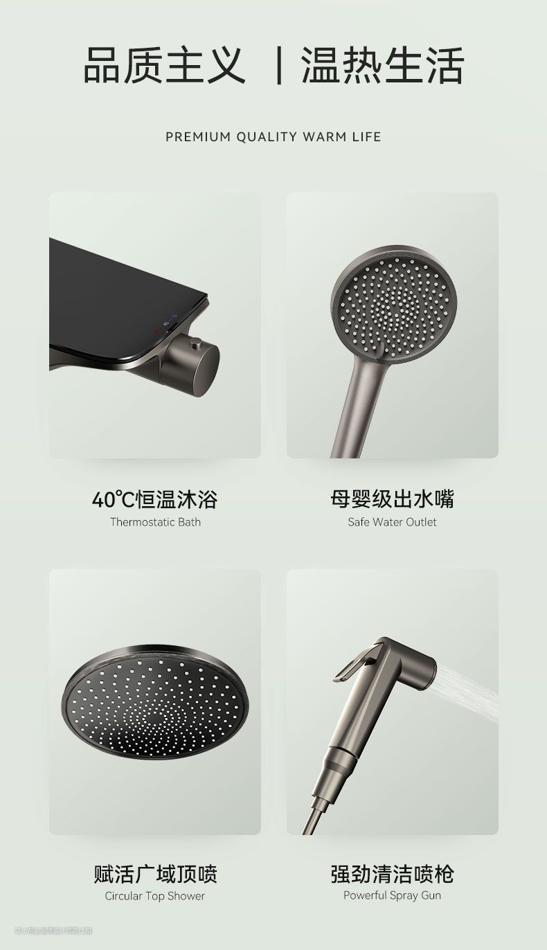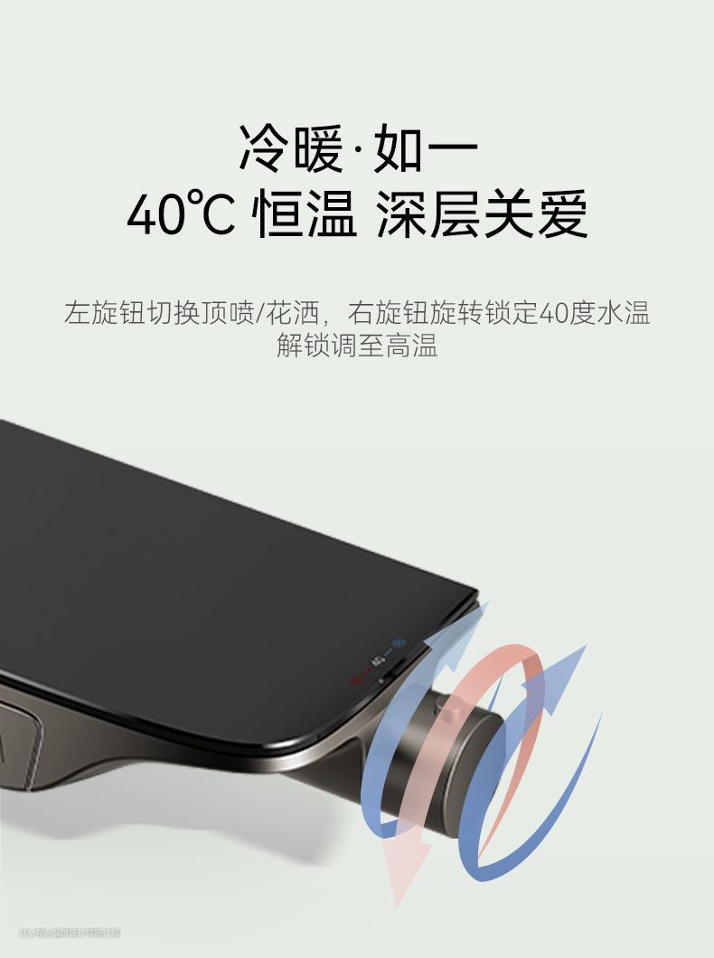 这款RESMO淋浴花洒的“恒温控温,一键锁温”功能简直不要太方便!能够让我们在洗澡的时候享受一如既往的恒温体验,向左边旋钮能够切换顶喷和花洒,向右旋转可以直接定位到40度水温,按下解锁键后才能够继续调高水温,安全又高级!