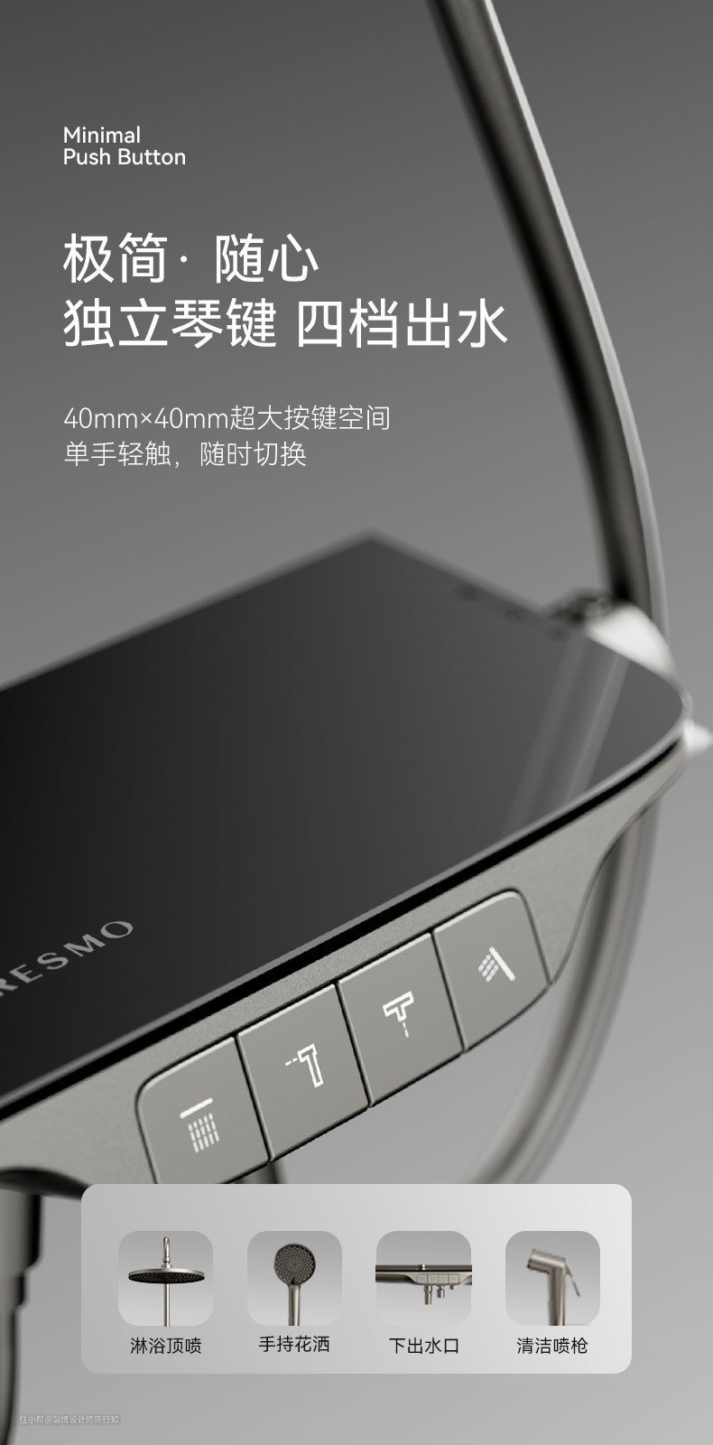 RESMO淋浴花洒在设计上采用钢琴按键开关模式,三功能独立操作,标识清晰,将45mm*14mm超大按键空间植入到防滑条上,让我们在洗浴过程中随时切换出水方式,简单方便。