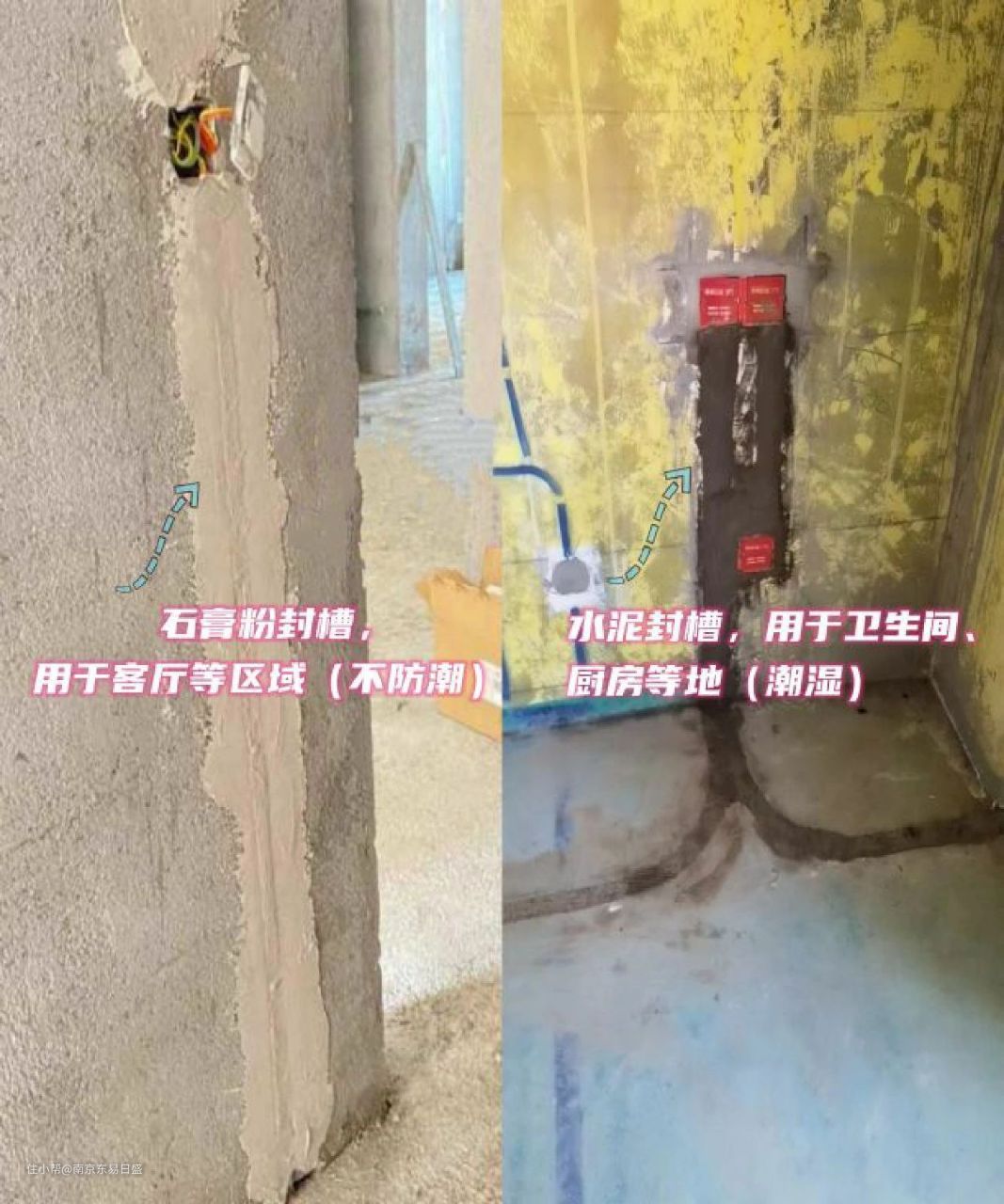传统的封槽工艺为水泥封槽,一般用于卫生间或厨房等容易潮湿的地方,而客厅等地方可用石膏粉。