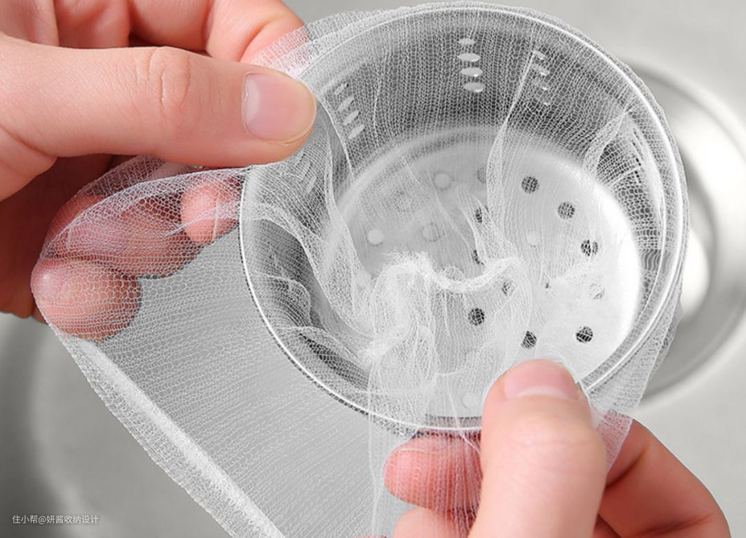 渔网状的过滤网,既能挡住残渣,还能让水流很好的渗入下水道。只要在使用前,将过滤网套在水槽进水口就能完美解决。水槽使用完毕后,只需倒出滤网中的残渣即可。