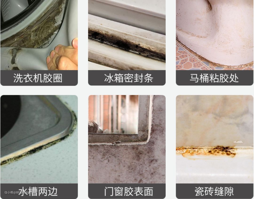 对付塑料制品、瓷砖、胶条、大理石、硅胶等霉渍,涂上静置数小时,基本都能清除。