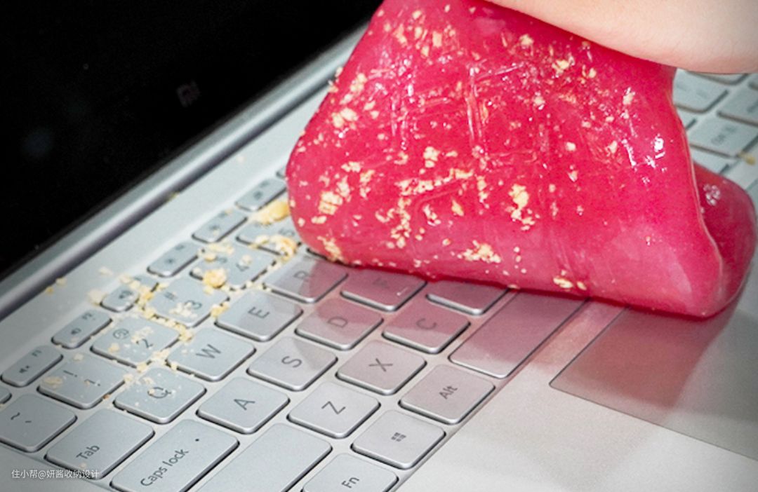 最早这个粘粘乎乎的东西,被用于清洁键盘。对于键盘这样细小的缝隙,可以随意变形的清洁软胶,就可以很好地深入缝隙,粘出那些犄角旮旯的灰尘。而清洁软胶也可以多次使用,清洁次数越多,胶体的颜色就会越来越深,到了最后,毫无留恋的抛弃即可。