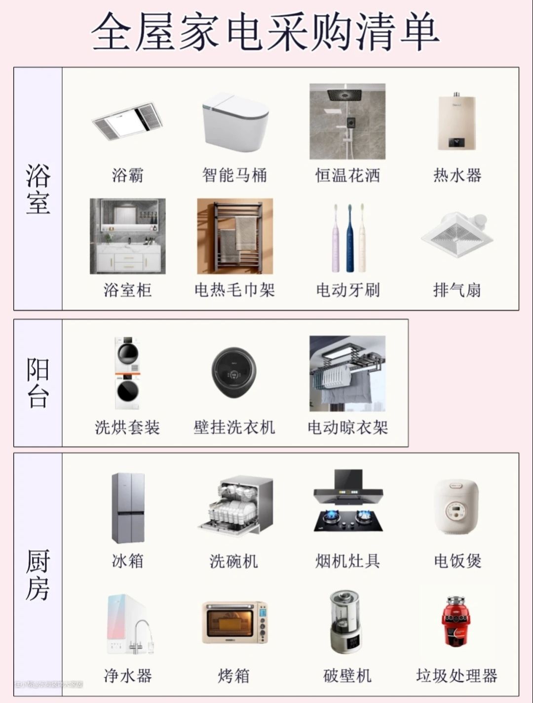 中央空调、新风系统、净水系统、智能家居系统、冰箱、洗衣机、烘干机、投影仪、电视机、音响、热水器、烟机灶具、消毒柜、电饭煲、榨汁机、洗碗机、扫地机器人等。
