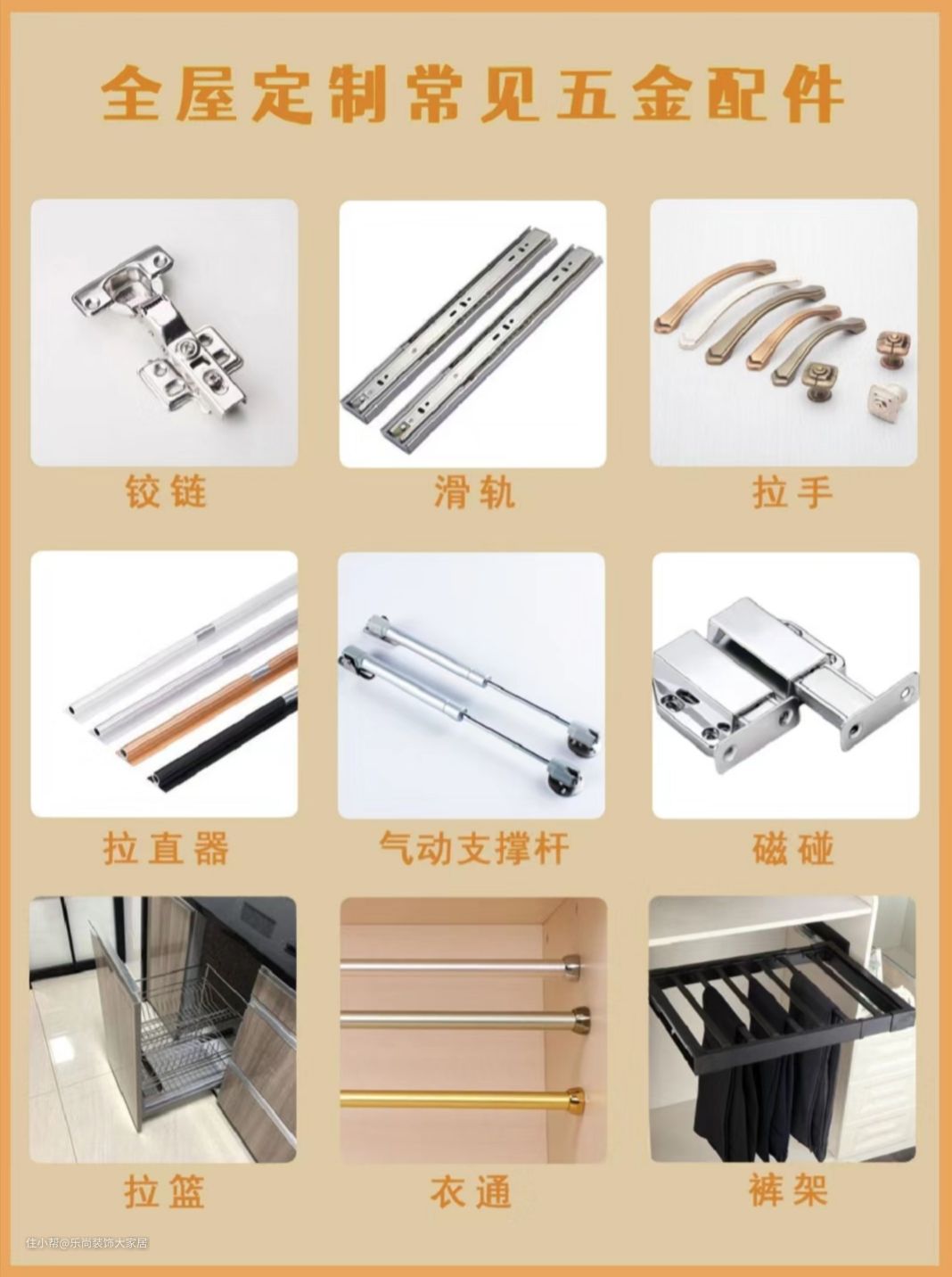 - 五金 [ 合页、拉手、阻链、五金挂件、毛巾架、卷纸盒、晾衣架、衣柜内挂衣杆、穿衣镜、挂衣钩等 ]