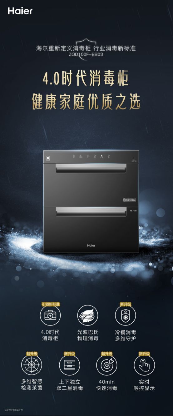 而医疗级消毒柜通俗来讲,是指在二星级标准基础上,可对金黄色葡萄球菌、白色念珠菌等6种致命病菌进行灭杀,满足更高消毒标准需求。而这款海尔嵌入式消毒柜EB03是医疗级消毒柜,这款医疗级的消毒柜是海尔4.0时代新升级消毒柜,消杀6种病毒。