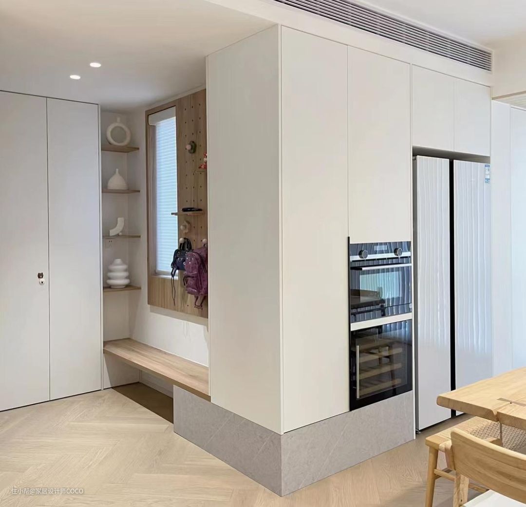 ①木饰面。木饰面不仅可以提高空间的高级感,而且可以耐脏耐污,当然木饰面不仅仅是指木纹色,选择白色、灰色等素色烤漆板均可。