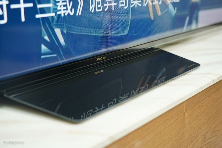 小米大师86英寸采用的是中置底座,玻璃材质镜面雅致黑,悬浮设计,底座非常厚重,座装摆放很稳固。XIAOMI logo位于底边正中央,拾音麦克风位于两侧。