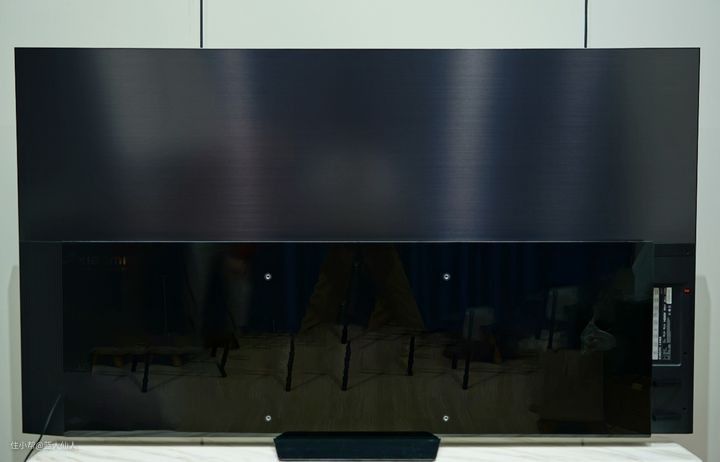 背板设计是黑色玻璃材质,所以会有镜面反光,看着整洁干净。而且除了挂装螺丝以外没有其他的螺丝孔,一体化非常好。