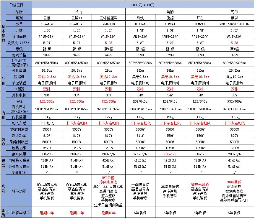 前面我们讲到了,在选择空调时,1匹挂机和2匹柜机基本上都是减配后的机型,挂机尽量选1.5匹,柜机选3匹,所以在接下来推荐的机型中,我们会优先推荐。