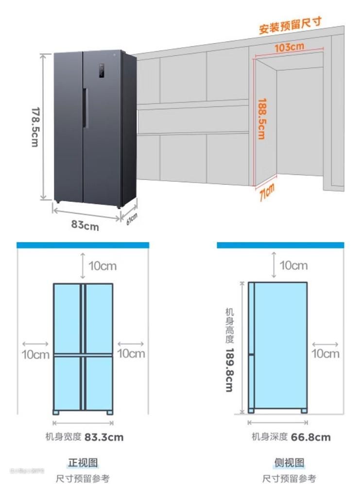 如下图,两个冰箱的宽度都是83cm左右。双开门冰箱的容量只有456L,十字门冰箱却可以做到523L。