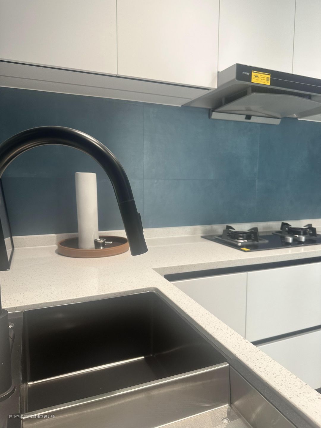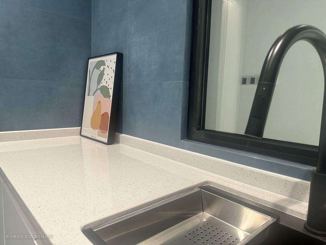 厨房墙面用的大面积青色瓷砖,色彩丰富,窗台石是用同样的砖切的,这样的方式最直接简单。珍珠白哑光吊柜和地柜,内嵌铝条灯提升使用体验,地面铺的灰色地砖,耐磨好打理。灶具选的方太,台下水盆,龙头抽拉式。