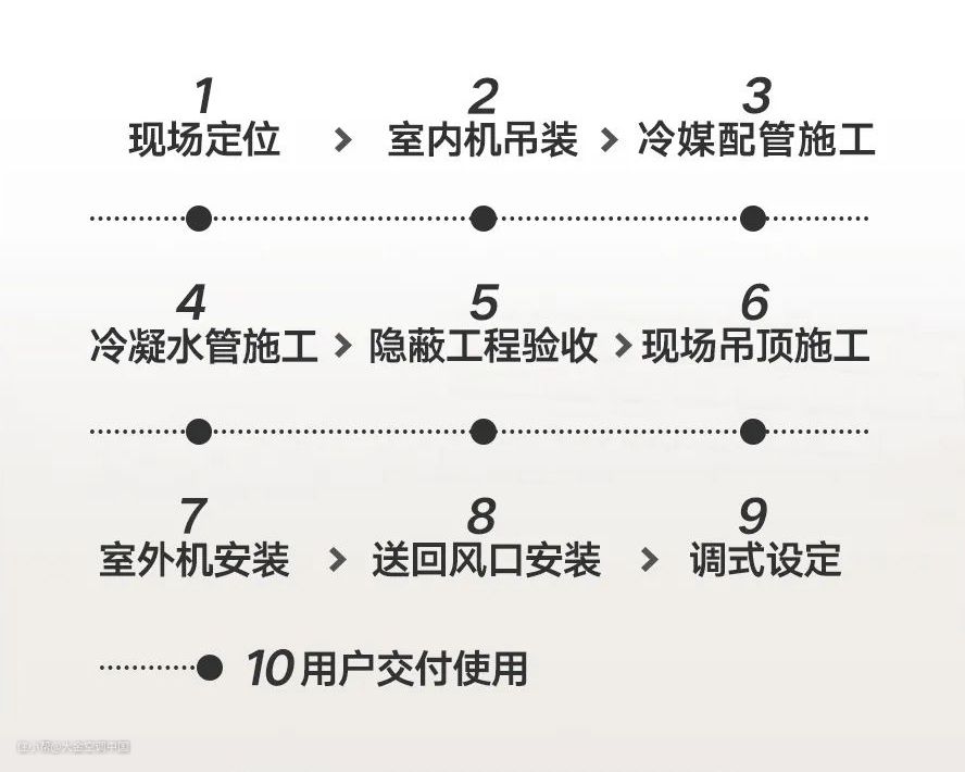 中央空调安装一共有以下10个流程,全屋的装修进程需要紧密配合的有下面3个阶段。