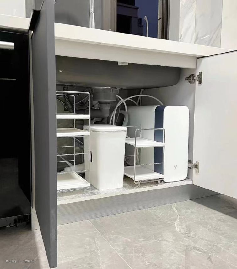 它机身高度跟一张A4纸差不多高,厚度也仅有一掌宽。靠在水槽下方的橱柜里,完全不浪费空间,四四方方的外形也方便靠墙放置,搭配收纳盒使用,连顶部空间也不会浪费。