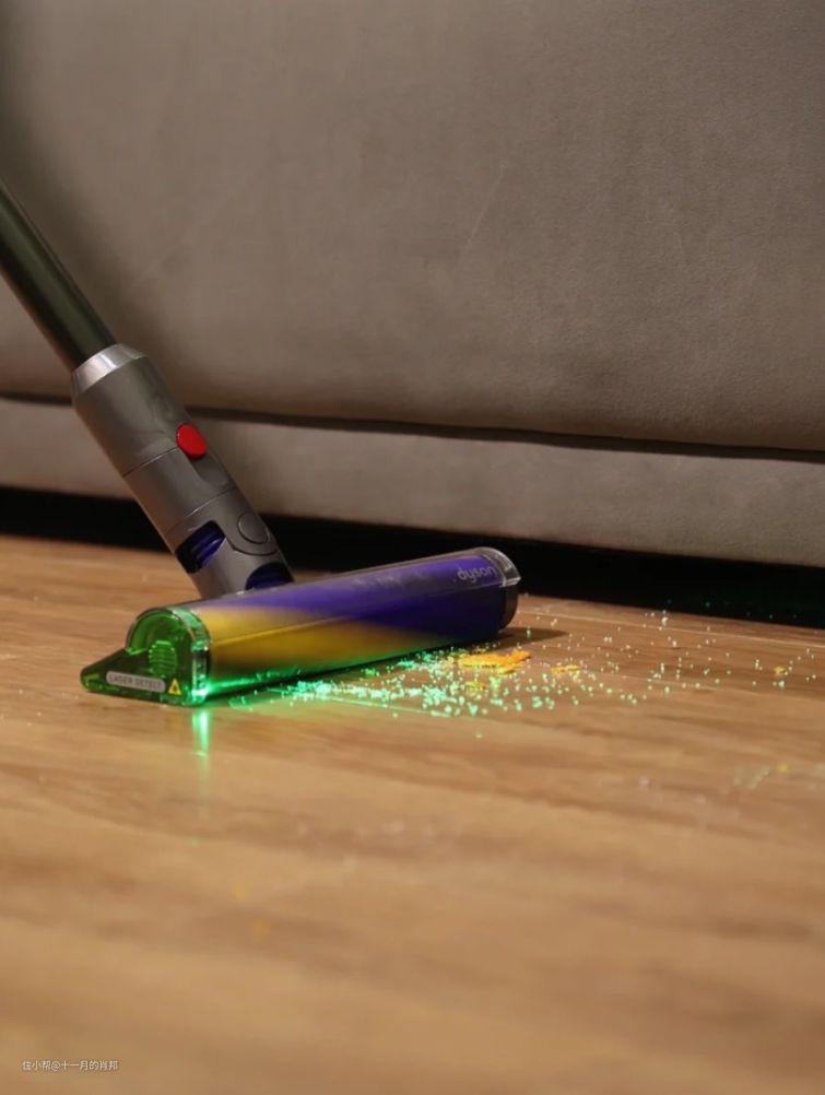 特别吸引我的是V12的激光探照功能真的是一绝,普通的吸尘器是用 LED光照亮地面,但是灰尘和瓷砖就会一起照亮,但戴森V12轻量无绳吸尘器是直接照亮灰尘,肉眼很难看见的微尘都可以在激光下显示的一清二楚,实现精准清洁当做家务瞬间变得高效起来。