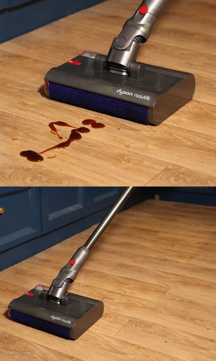 用的时候两片清洁擦布会一直转圈,据说每分钟能转200多圈,就像人的手拿着抹布在打着圈擦地,厨房地上牛奶渍、油渍也不用担心清洁不到位了,而且还可以智能识别灰尘量,如果灰尘多的地方吸力瞬间变大,配有LED显示屏,吸力变大时灯会从蓝色变成红色提示,用起来真的别提多方便了。