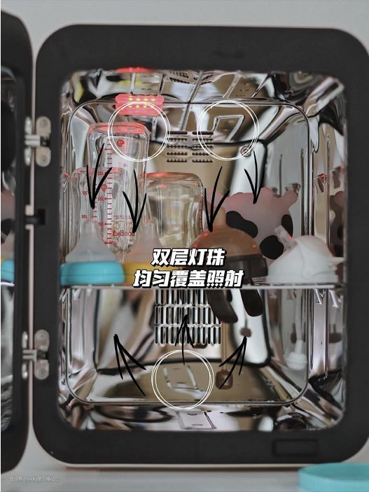而上下双层灯管照射则完全没有这个顾虑,而且可以配合毒柜中六个内表面折射光线,在给奶瓶消毒时可以全方位,没有死角的照射消毒。