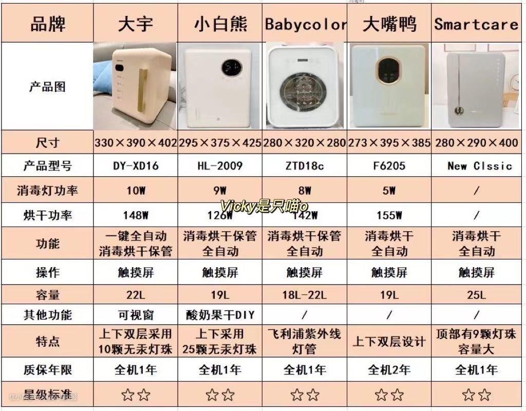 总的来说,大宇紫外线消毒柜这款在运行中噪音小,消毒烘干效果好无水渍,灯珠数量多,灭菌菌种也多,是这五款中性价比很高的一款奶瓶消毒柜!