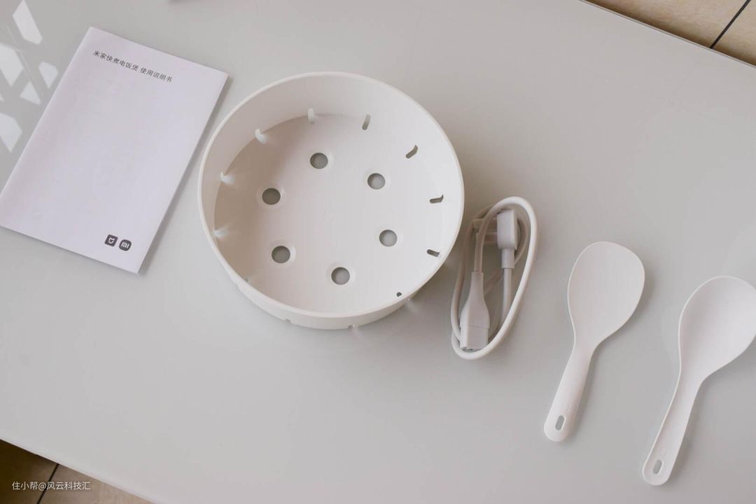 配件包括内胆、蒸格、电源线、饭勺、汤勺和使用说明书,平时煮饭的时候,放上蒸格可以给孩子蒸鸡蛋羹或蔬菜。