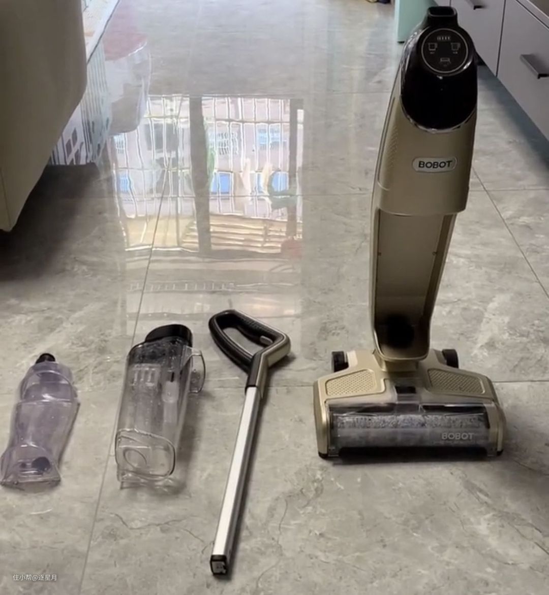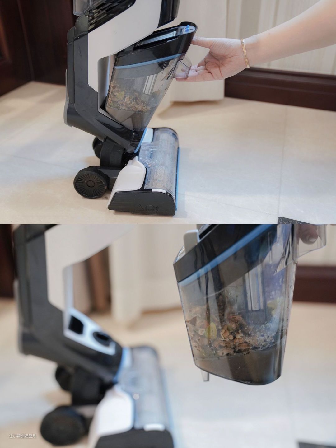 不过对我来说还是很方便,不用拿拖把拖地,遇到湿垃圾不用动手去接触。平时我上班又比较忙,只需要隔2天拿洗地机拖拖两下地板很干净。