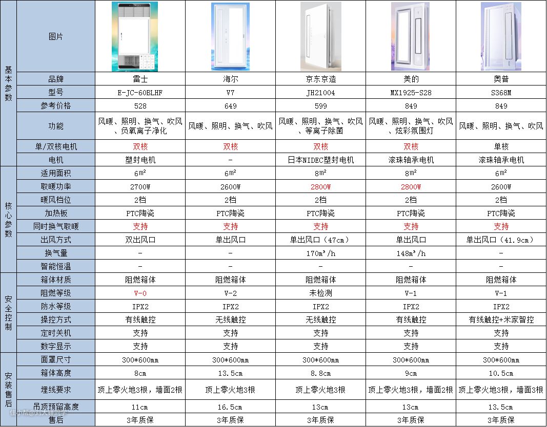 美的MJ1920-D22价格比上面的京造略低,不过采用的是单核电机,不支持同时取暖和换气,2200W功率有点小,而且安装时需要预埋的线有点多,不过V-1阻燃等级和IPX2防水等级,在安全性方面表现不错,如果是4㎡以内的浴室使用性价比还行。