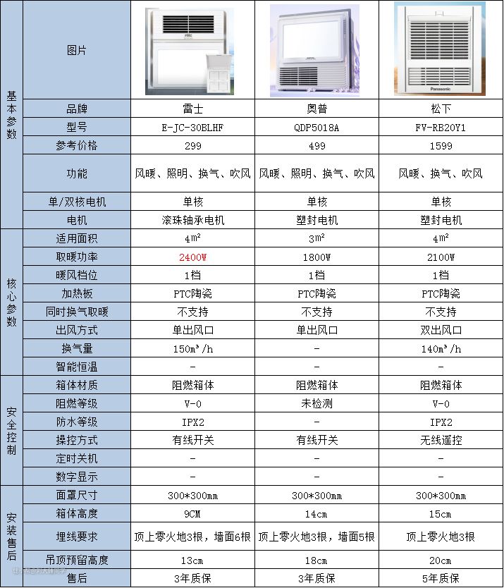 雷士 E-JC-30BLHF支持风暖、照明、换气和吹风等功能,2400W的PTC额定功率,150m³/h换风量,足够4-5㎡浴室使用,9cm超薄机身,有线开关,安装时做好墙面预埋后还是挺方便的,在安全方面也非常不错,作为普通灯暖的平替非常不错。