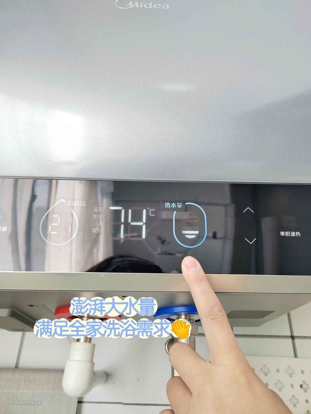 而且我们每次在用水前都可以通过这块大屏实时查看热水的水温和水量,可以有效避免洗澡时水量和水温不够的尴尬。