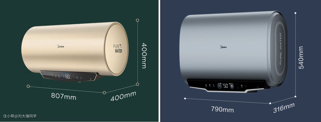 从上面两款同样是60L容量的电热水器对比图中我们不难看出,扁桶热水器身材更苗条、大方,看起来也更舒服;圆桶热水器肚子看上去更圆,多出来的80mm厚度部分我们站在底下容易碰头,利用率会变差,接下来我们把两款热水器上墙对比。