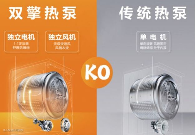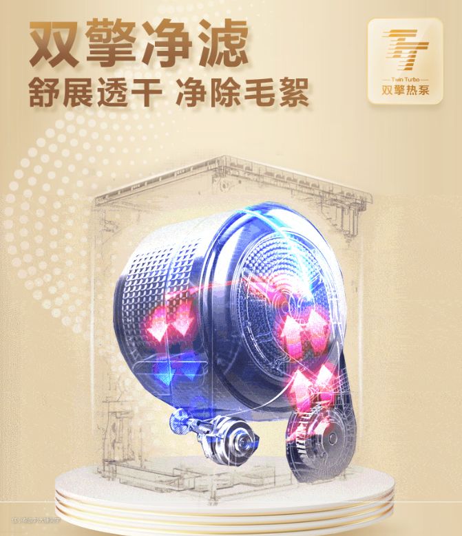 海尔创新的双擎热泵烘干技术,主要体现在双擎电机上,在烘干机内部有两个电机,分别单独驱动内筒和风机,能够实现干衣过程中全程1:1正反转。