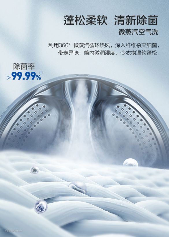 微蒸汽空气洗:高温加热产生少量水蒸气,可以微微湿润衣物进行护衣。