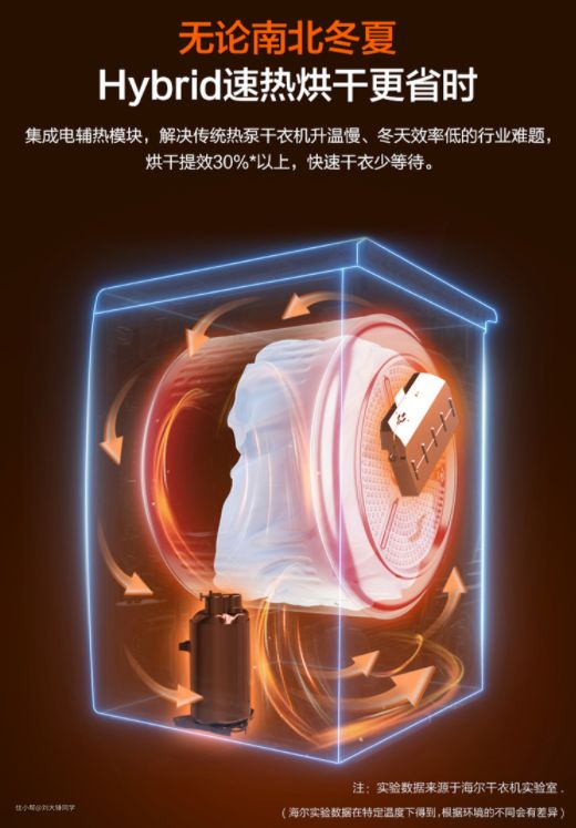而海尔的Hybrid混动速热技术采用的是PTC电热模块和热泵模块共同配合,在烘干初期阶段快速提高内筒的温度,加快达到最佳的烘干温度,当达到烘干温度后混动速热系统会自动关闭,无辅热系统的烘干机相比节省了30%的时间,提高烘干效率的同时也不会增加能耗。