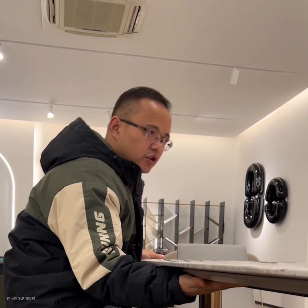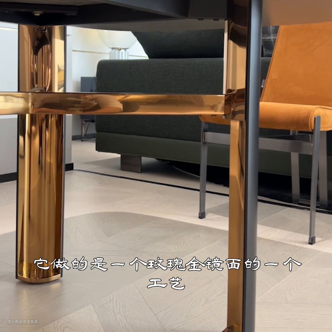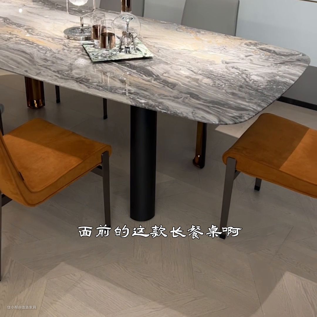 今天我们带大家去看一款长餐桌。这款长餐桌既可以放在餐厅区域,又可以放在极简。逐步出现在视频镜头面前的这款长餐桌,就是今天的主角。它整体的尺寸是2米2,宽度是1米!它整体的造型做的是一个马肚形。随着摄影师的镜头拉近,我们看一下,整个台面采用的是天然进口的奢石威尼斯棕。它有别称叫塞纳河畔的纹理,就像河流流经在这个过程中冲利出来的纹理,显得非常流畅。非常高级!奢华感也是满满。