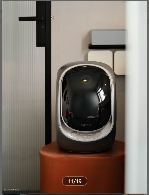 DN的尺寸是265mm*405mm*430mm,大小更一张A4纸差不多大。机器形状是一个不规则的圆型,门体是向上掀翻开启,就是航空头等舱一样。门体上是全触控LED液晶显示屏,所有功能都可以在上面操控,科技感拉满。