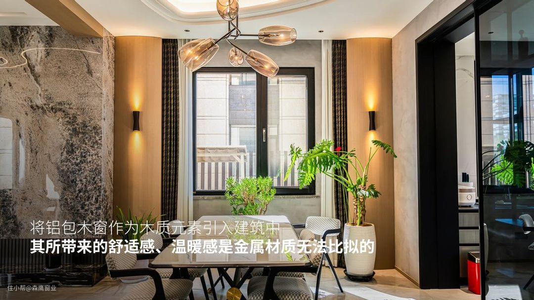 显然,将铝包木窗作为木质元素引入建筑中,其所带来的舒适感、温暖感是金属材质无法比拟的,尤其是木材表达出的触感,那是一种有生命力的感觉,是一种更能焕发业主精神的力量,再加上如白橡木、红松木、核桃木等木材,它们中的每一种木材给人感觉与其本身性能都有差异,这也让业主在选择时有了更多空间,满足自身需求。