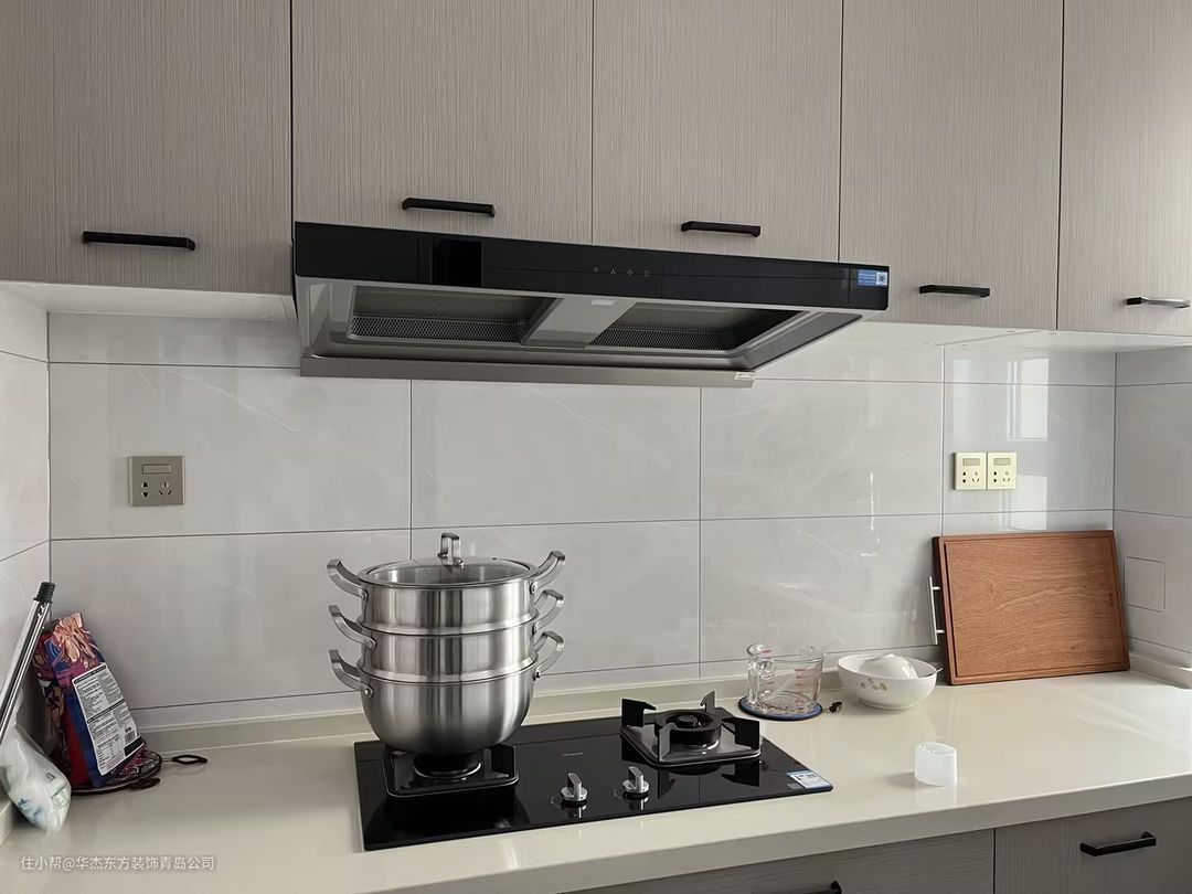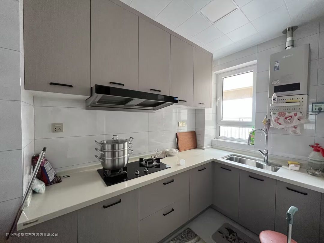 高级灰橱柜+灰色吊柜,白色台面搭配,线条感设计令人舒适,以一种简约有质感的空间方式呈现出来